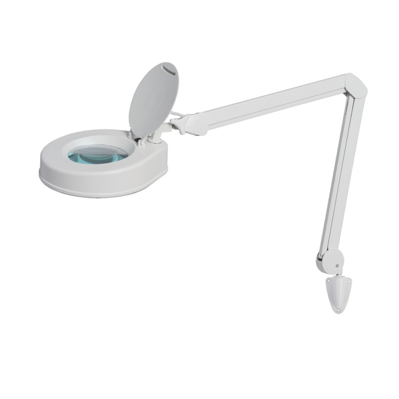 Incorpora una lupa fluorescente circular de 22W y 5 dioptrías. Produce una luz sin sombras y no calienta. Brazos compensados por muelles internos. Interruptor situado en el cabezal. Cabezal ajustable. Tapa de seguridad para evitar polvo, rozaduras u otros factores externos que puedan dañar la lente.