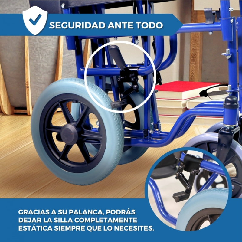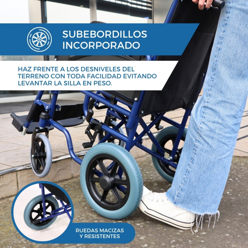 Esta silla de ruedas cuenta con una palanca de pie, la cual es de gran ayuda para el acompañante a la hora de subir y bajar pequeños escalones. Esta silla de ruedas plegable y ligera dispone de un juego de ruedas macizas. Esta característica suprime el riesgo de sufrir un pinchazo desacertado y la convierten en el producto perfecto para el uso de exterior.