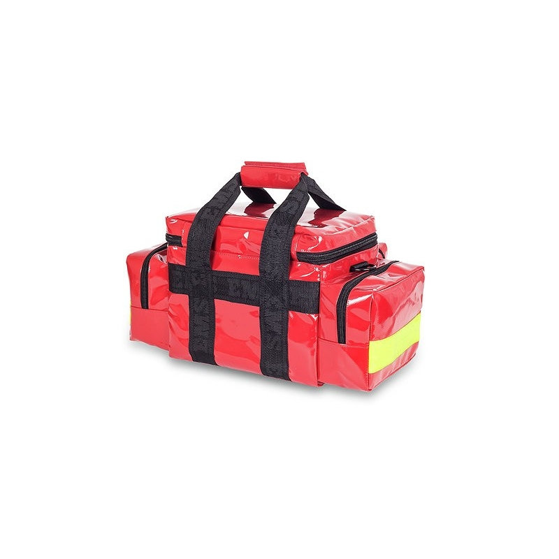 Es una bolsa de trabajo de emergencias médicas resistente al agua, útil y segura para situaciones críticas, que por sus dimensiones y características soporta pesos elevados. Además, el nuevo tejido de esta bolsa roja de emergencias (tejido tarpaulín) es fácilmente lavable en caso de derrame de fluidos, reduciendo las bacterias.