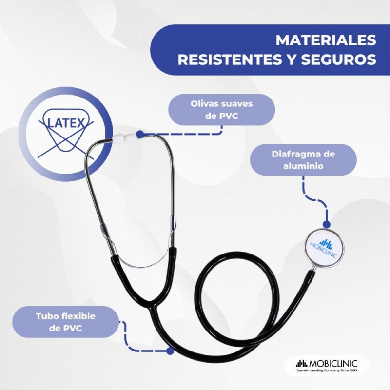 Se trata de un fonendoscopio negro de doble campana fabricado en aluminio y que se caracteriza especialmente por ser ligero, fácil de transportar y muy económico. Además, el producto está libre de látex. Este modelo de estetoscopio ofrece unas prestaciones imprescindibles para el buen hacer del profesional sanitario, como son unas propiedades acústicas realmente precisas para el diagnóstico más fiable.