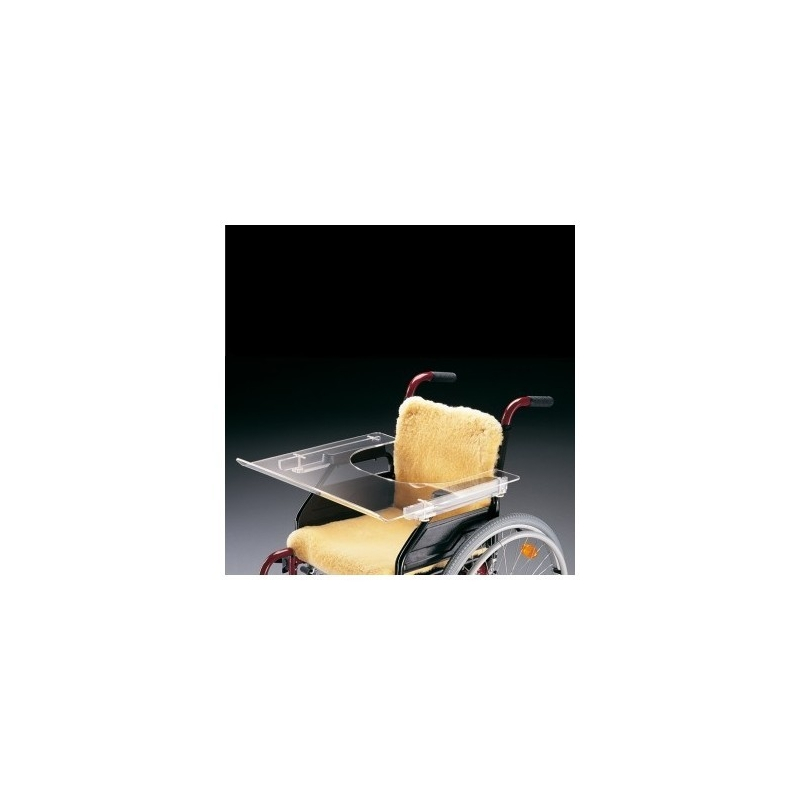 Bandeja de regazo de plástico transparente que proporciona excelente visibilidad de las extremidades inferiores. Se adapta a la mayoría de sillas de ancho exterior de 47 a 56 cm, siempre que tengan reposabrazos largos. Diseño ergonómico envolvente, con pestaña frontal.