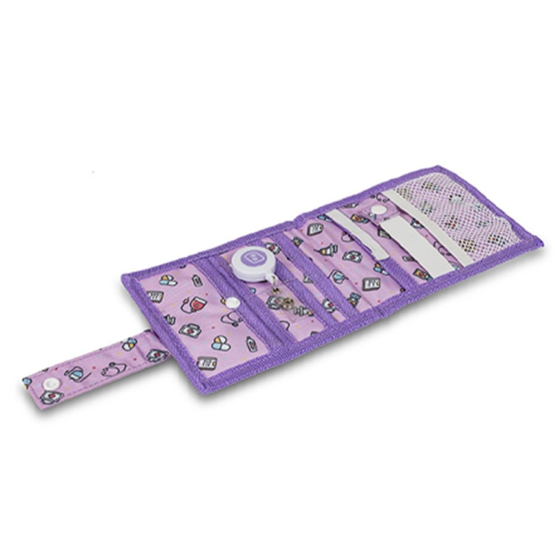 KEENS ESTAMPADO MORADO Organizador enfermería Pensado para ser transportado en el bolsillo de la bata y/o pijama para llevar los elementos necesarios en la enfermería intrahospitalaria, tales como: llaves de tres vías, tapones, linterna, pinzas, bolígrafo, esparadrapo, tijeras, etc. Sirve de forma independiente como organizador de mesa. Características Cierre con botón de presión metálico e imán 3 bolsillos planos interiores Bolsillo de rejilla Cinta para esparadrápo Sistema retractil de sujección de tijeras