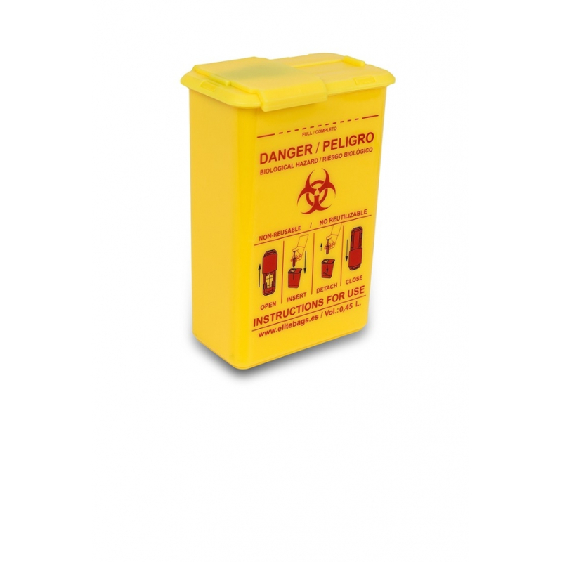 CONBIOS XL Contenedor agujas de bolsillo Gracias a su gran tamaño, permite realizar consultas de una manera limpia y segura. Su tapa está diseñada para facilitar la inserción hacia el interior del contenedor, evitando que puedan salir accidentalmente lo previamente introducido, ofreciendo así al profesional una total seguridad. Este contenedor es de un solo uso.