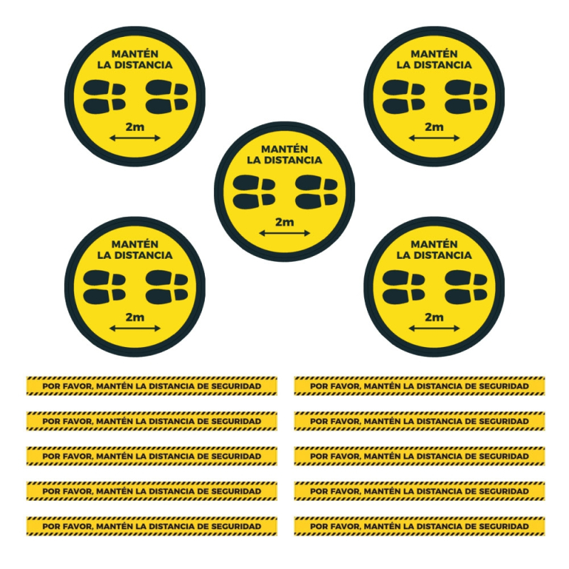 MEDIDAS: El pack contiene 5 señalizaciones de suelo con forma circular de 30 cm de diámetro y 10 con forma rectangular de 150 x 10 cm. Todos son vinilos de suelo para superficies planas, removibles sin residuos con laminado antideslizante.