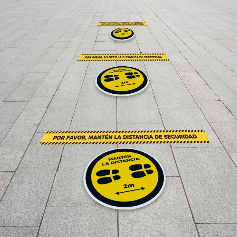 Pack vinilos suelo Covid-19 | Distancia Seguridad | 5 Círculos 30 cm | 10 Tiras 150x10 cm