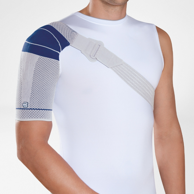 Vendaje activo para tratar la articulación del hombro. El tejido activo tridimensional Train se adapta de manera óptima a la forma del cuerpo, garantizando una gran comodidad. Opcionalmente se puede fijar con velcro la nueva almohadilla delta viscoelástica con puntos de fricción y posicionarla según sea necesario. Debido a la guía directa de las cintas, el vendaje se puede colocar con facilidad y rapidez. El tejido y el sistema de cintas están hechos de materiales suaves para la piel y transpirables.
