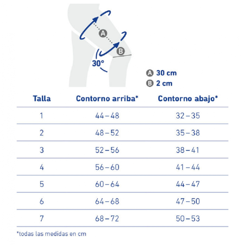 La talla va en función del contorno del muslo, siendo la primera medida que aparece el contorno de arriba y la segunda el contorno de abajo.