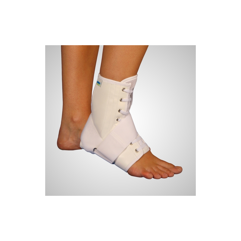 Esta tobillera estabilizadora antiesguinces incorpora una cincha inelástica pronadora que estabiliza la articulación en pronación y evita los movimientos de supinación o inversión durante la marcha. La adaptación y el cierre se realiza mediante cordonera para conseguir un perfecto ajuste. Contiene dos varillas espirales laterales. Perfecta para tratamiento del esguince grave y de repetición, preventiva durante la práctica deportiva, tratamiento estabilizador después de inmovilización prolongada.