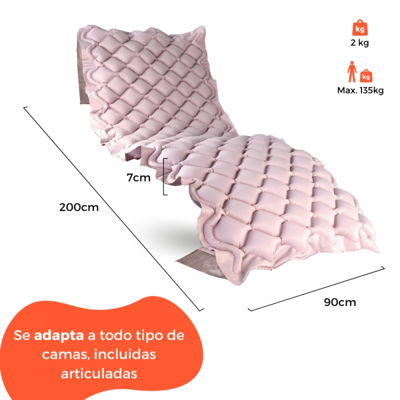 MÁS RESISTENTE Y EFECTIVO: Gracias a que contiene más plástico, el colchón pesa en torno a 2 kilos y refuerza la resistencia a la presión en sus celdas. Esto garantiza su efectividad en el paciente con total comodidad