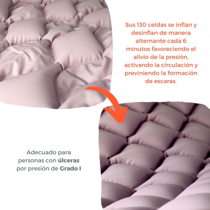 EFICACIA TERAPÉUTICA: este colchón antiescaras ayuda a reducir el dolor del paciente y a aliviar la presión que genera el estar prolongados periodos de tiempo tumbado, mejora la circulación sanguínea y ayuda a reducir la fricción con el colchón y la aparición de escaras gracias a sus 130 celdas individuales de aire que se inflan y desinflan alternativamente en periodos de seis minutos