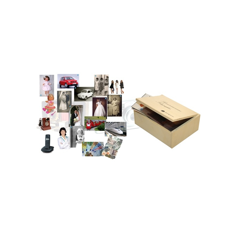 Caja de madera conteniendo 40 fotografías de gran espesor para una larga duración y de medidas 10x15x0,5 cm.