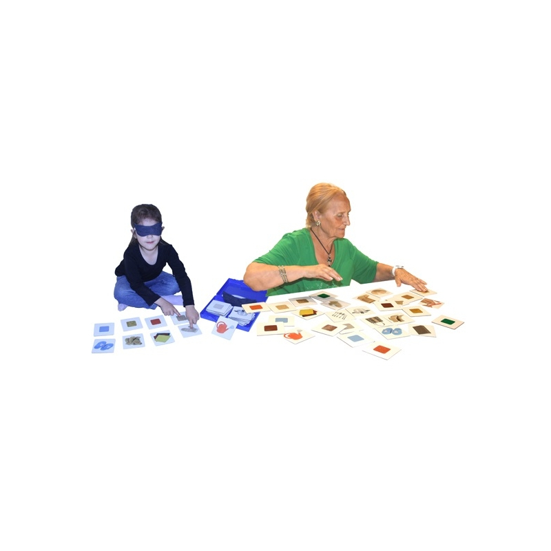 Juego asociación tacto y foto | Desarrolla el sentido del tacto | 16 fichas tacto + 16 fotos + 2 antifaces