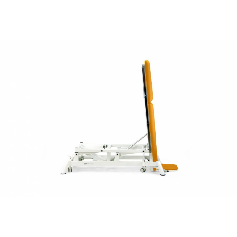Camilla de bipedestación/plano inclinado para pediatría de 2 secciones con regulación de altura y verticalización motorizadas, apoya pies independientes y regulables (proclive/declive), respaldo elevable, guías laterales para anclaje de las cinchas de sujeción y accesorios varios y ruedas escamoteables.