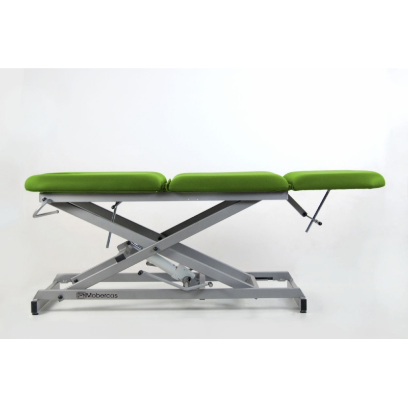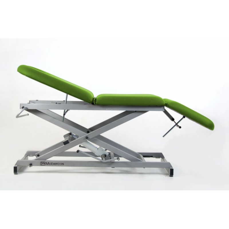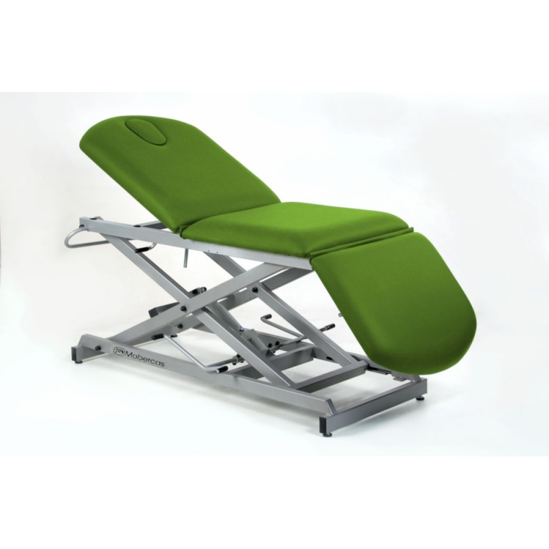 Camilla hidráulica tipo sillón de 3 secciones con subida recta sin desplazamiento lateral, con portarrollos y tapón facial.