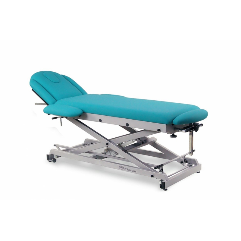 Camilla eléctrica multifuncional para osteopatía de 7 secciones con subida recta sin desplazamiento lateral, tapón facial y ruedas escamoteables. Respaldo reclinable en negativo con brazos, brazos laterales y apoya-pies regulable y extraíble.