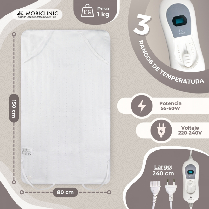 Calientacamas individual | Eléctrico | 3 niveles de temperatura | Apagado automático | Lavable | 150x80cm | Blanco | Mobiclinic Joaquin . Calentito y graduable 14/05/2020 |