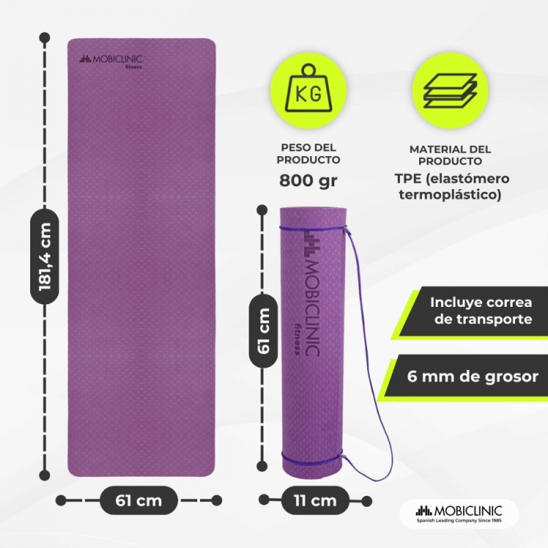 Esterilla de yoga | Antideslizante | 181x60cm | 6mm grosor | Cinta transporte | Flexible | Ecológico | Morado |EY-01| Mobiclinic
