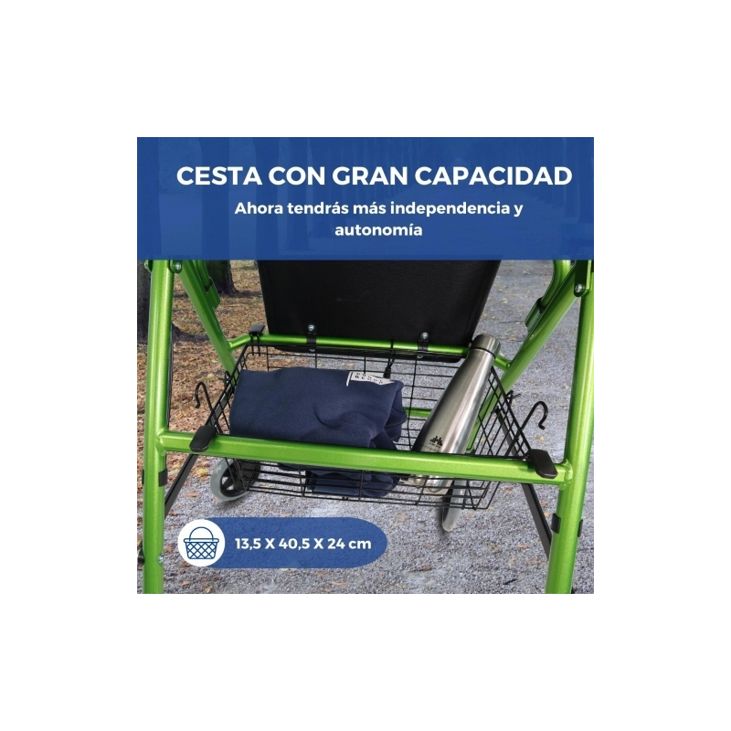 Este andador de aluminio cuenta con un asiento y un respaldo acolchado para garantizar el confort y la seguridad, así como un descanso adecuado después del esfuerzo. Incluye una cesta pensada para guardar las pertenencias de manera segura y cómoda mientras caminas. Puedes colocarla tanto debajo del asiento como en la parte delantera del andador.