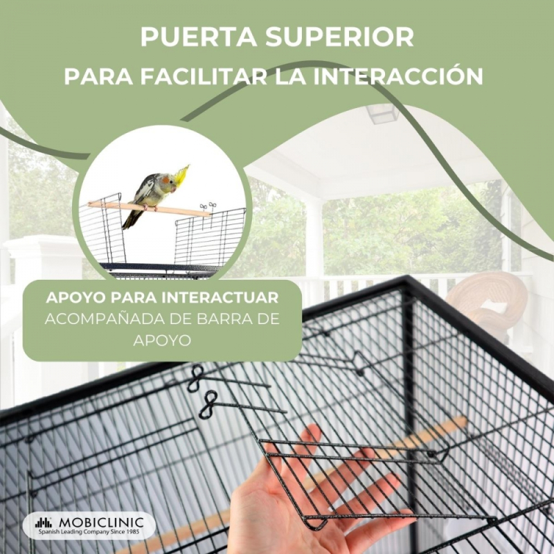 ACCESO SUPERIOR: Además de las 3 perchas de apoyo interiores, dale a tus aves la libertad que merecen gracias a su puerta de acceso superior. La jaula Ninfa cuenta con una barra de apoyo que se puede unir a los paneles de la puerta en la parte superior para que tus pájaros puedan posarse cómodamente o descansar mientras disfrutan del entorno. ¡Descubre un nuevo nivel de comodidad y cercanía con tus amigos alados!