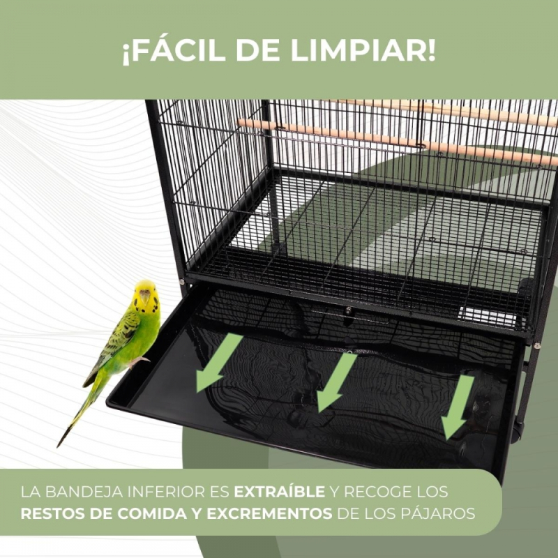 RUEDAS DIRECCIONABLES: Sus cuatro patas disponen de ruedas direccionables para que puedas trasladar a tus pájaros a cualquier habitación o incluso el patio o jardín. También cuentan con freno para evitar que se mueva excesivamente en superficies más resbaladizas y asegurar la jaula.