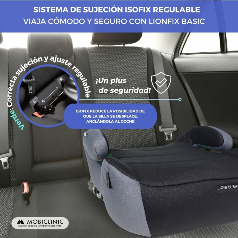 Con Lionfix Basic tendrás todas las garantías de seguridad a la vanguardia gracias a su sistema IsoFix. Se trata de un tipo de anclaje fácil de instalar y que permite fijar el sistema de retención infantil directamente al chasis del vehículo de forma rápida, lo que ofrece una mayor estabilidad y reduce el riesgo de latigazo cervical ante un impacto frontal con este elevador de coche.