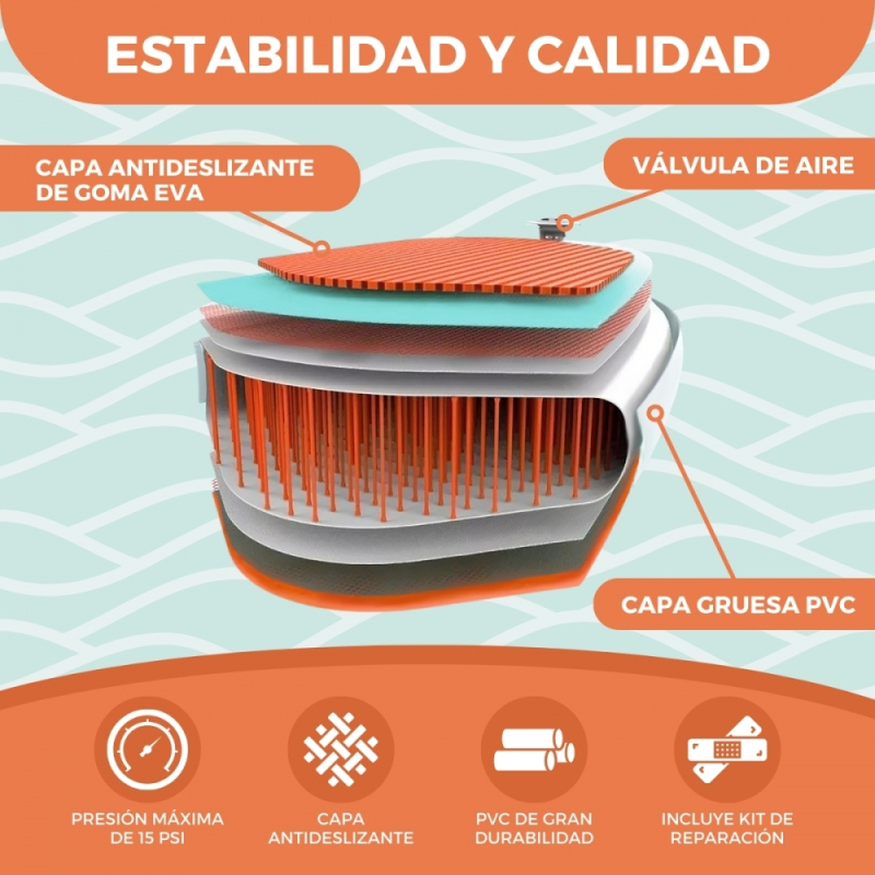 Garantía 3 añosKIT COMPLETO: Nuestro exclusivo kit te ofrece todo lo necesario para sumergirte en la emocionante experiencia del paddle surf hinchable. Desde la tabla hasta los accesorios esenciales como la bomba con manómetro y el remo ajustable hemos reunido todo lo que necesitas para empezar tu aventura acuática de inmediato. Además incluye kit de reparación.