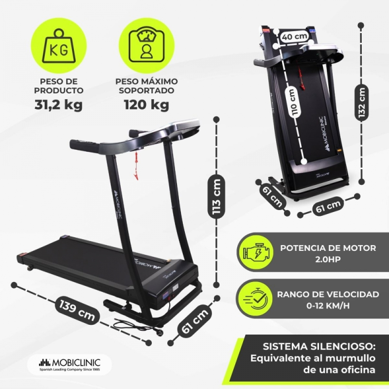 Cinta correr andar plegable|Bluetooth altavoz|12km/h|Sistema elevación|App pantalla LCD 139x62x114cm|Silenciosa|ETNA|Mobiclinic