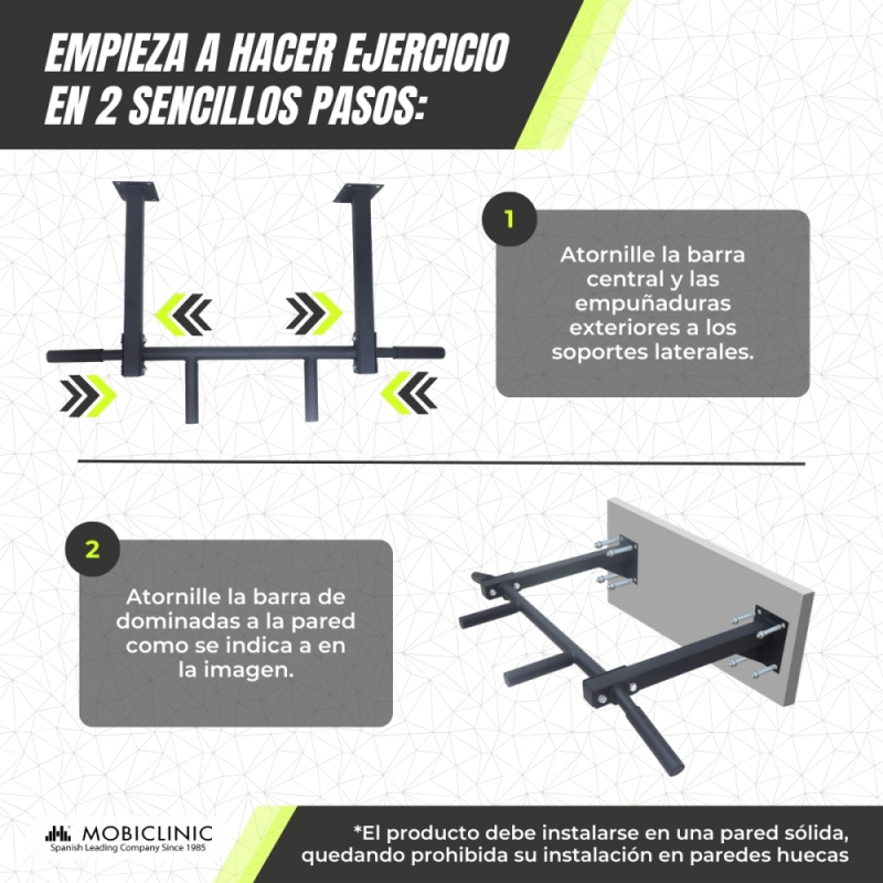 Barra de Dominadas Pared | Kit Anclaje Incluido | Acero | 95x55.5 cm | Máx. 250 kg | Ejercicios de Fuerza | Mod K3 | Mobiclinic