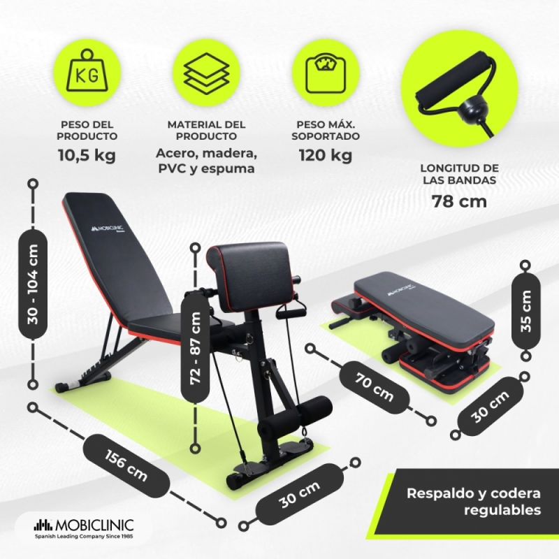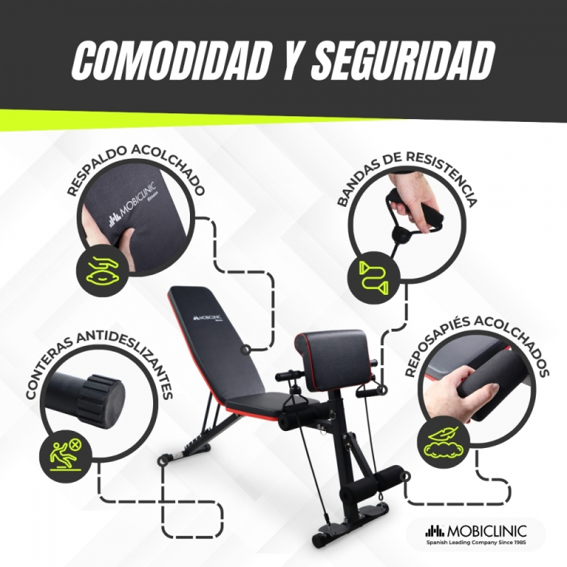 Banco de musculación | Con cintas de resistencia | Plegable | Ajustable y reclinable | Máx. 120kg | Planefit | Mobiclinic Alberto . Banco de musculación muy versátil, perfecto para entrenar en casa. Se ajusta a diferentes posiciones y permite hacer varios ejercicios. 24/02/2025 |
