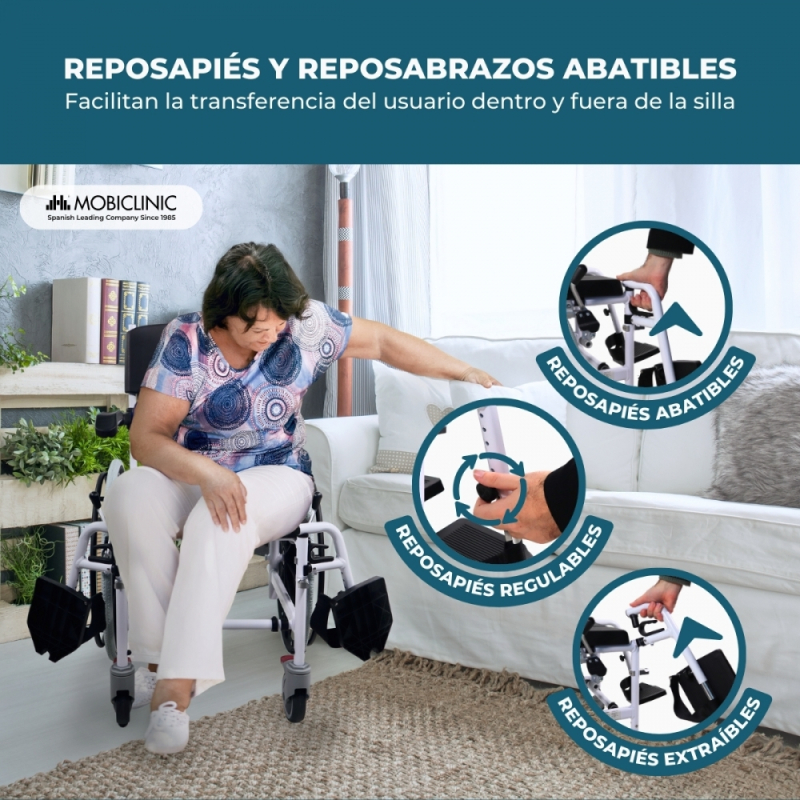 DISEÑO FUNCIONAL: Cuenta con asiento acolchado, reposabrazos y reposapiés abatibles para facilitar el acceso y garantizar la comodidad del usuario durante su uso. Estos elementos son impermeables y de secado rápido, ideales tanto para el baño como para el aseo diario. Además, la altura es regulable de 93,5 a 101 cm.