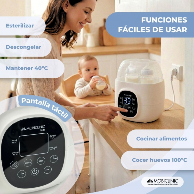 En su panel de control es posible seleccionar entre 6 funciones diferentes según las necesidades y el momento: calentar biberones, mantener su temperatura, esterilizar, descongelar leche, cocer o calentar alimentos. La temperatura es ajustable entre 37C y 90º, adaptándose a cada uso.