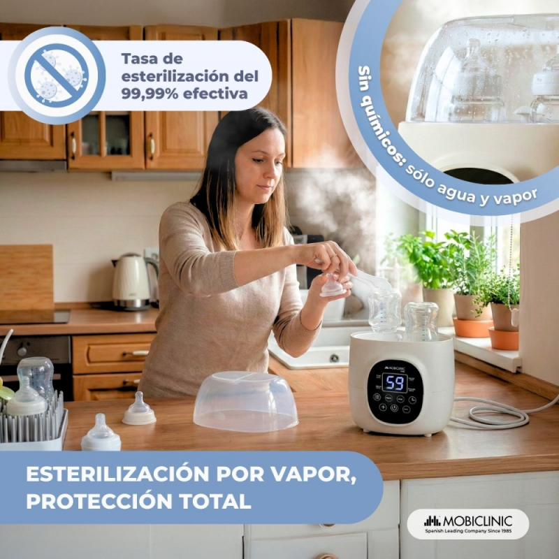 ESTERILIZACIÓN SEGURA: Este calienta biberones cuenta con un sistema de esterilización por vapor de alta temperatura con una eficacia del 99,99% eliminando bacterias y gérmenes. Perfecto para mantener los utensilios del bebé como chupetes y biberones higienizados, sin necesitar dispositivos adicionales