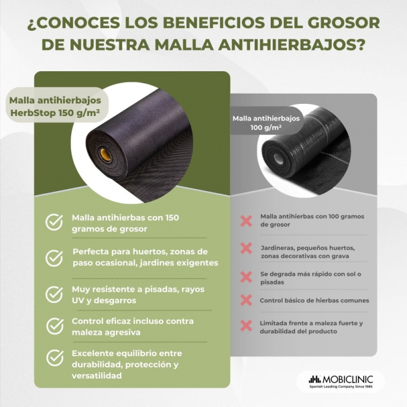Malla antihierbajos | 150g/m² | Resistente a rayos UV | Transpirable y permeable | 1 x 50 m | HerbStop | Mobiclinic