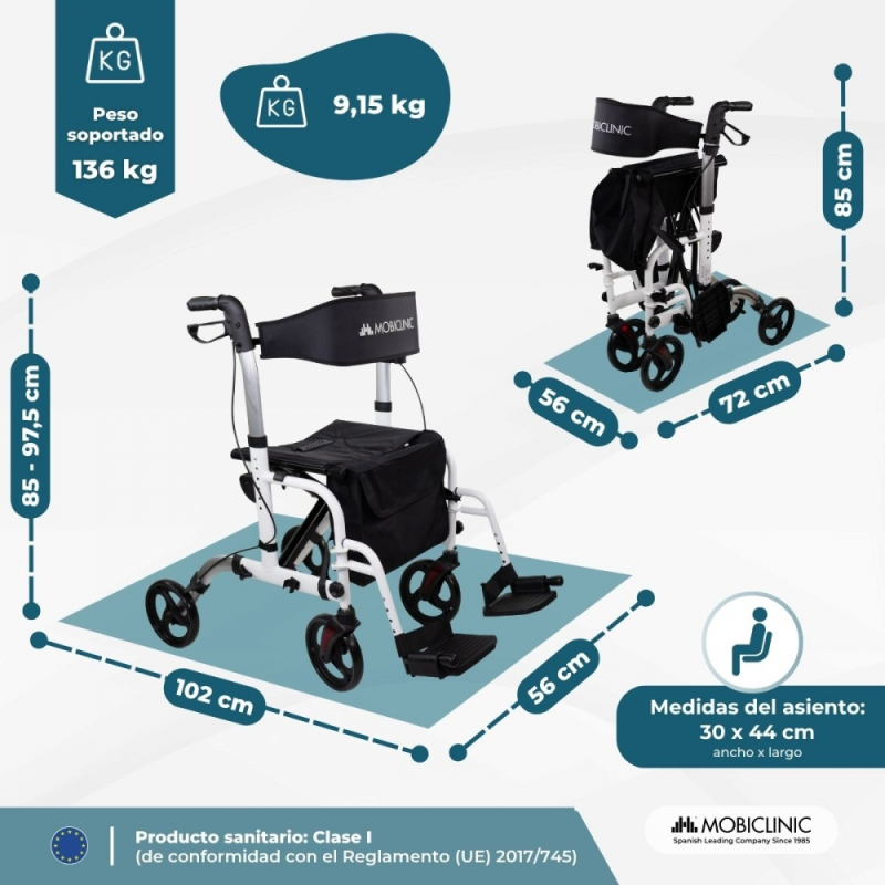 Andador con reposapiés y respaldo | Plegable | Aluminio | Frenos | Ruedas 360º | Bolsa | Porta bastón | Ibiza | Mobiclinic