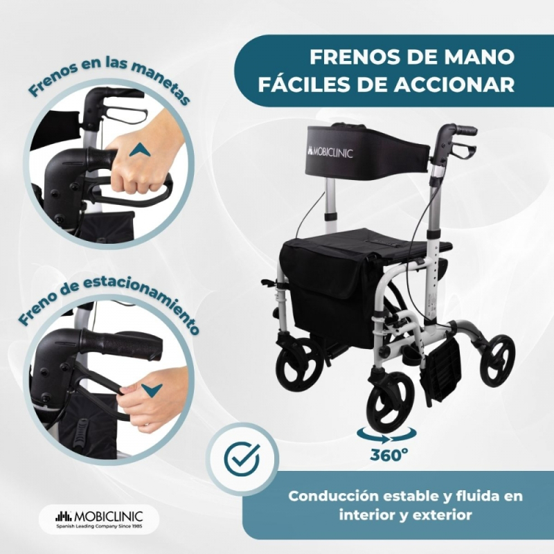Andador con reposapiés y respaldo | Plegable | Aluminio | Frenos | Ruedas 360º | Bolsa | Porta bastón | Ibiza | Mobiclinic Teodoro . Las ruedas 360º hacen que sea muy fácil de maniobrar en cualquier espacio. 27/09/2025 |
