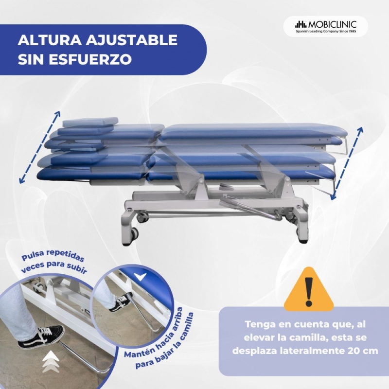 Su respaldo de ajuste mediante resortes de gas de 0º a 70º, permitiendo una inclinación progresiva y suave. Gracias a esto, es una opción perfecta tanto para tratamientos en posición horizontal como mediosentada. El sistema hidráulico con pedal para la regulación de altura evita esfuerzos innecesarios. Además, al elevar la altura, la camilla se desplaza lateralmente 20 cm, esto debe ser considerado para su correcta ubicación. Gracias a sus palancas laterales, permite trabajar desde cualquier lado, optimizando el tiempo y la ergonomía del personal.
