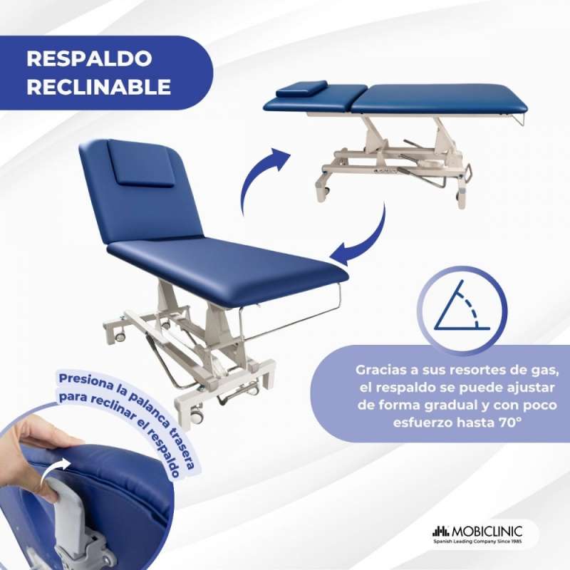 Camilla hidráulica | Altura regulable | Respaldo reclinable | Agujero facial | Ruedas escamoteables con niveladores | Mobiclinic Carmen . El respaldo reclinable permite ajustar la posición del paciente de forma sencilla y precisa. 13/10/2025 |