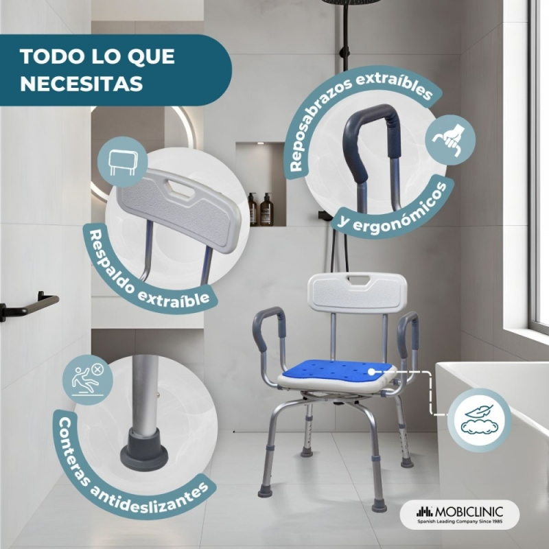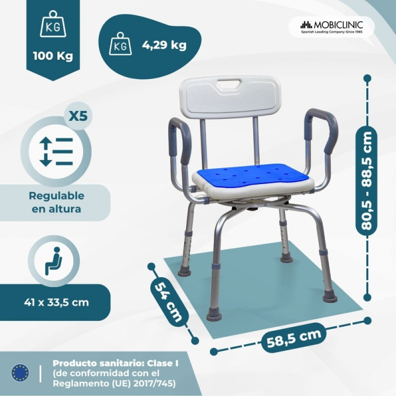 Banqueta de baño giratoria | Asiento 360º | Ajustable en altura | Apoyabrazos | Asiento EVA PAD | Akila | Mobiclinic