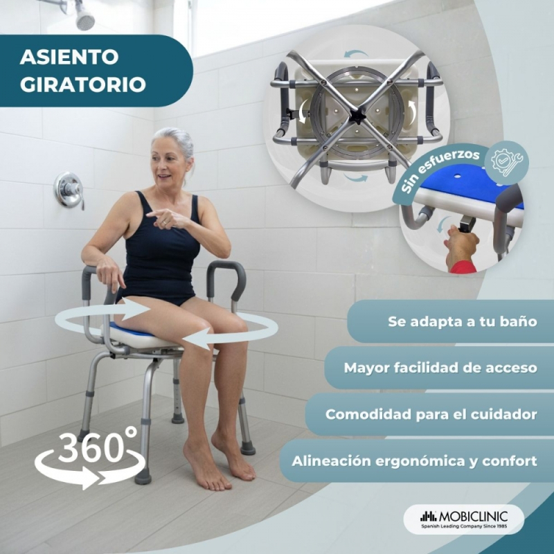Garantía 3 añosASIENTO GIRATORIO 360º: La banqueta de baño cuenta con asiento giratorio que permite cambiar de posición sin tener que realizar giros forzados del cuerpo, reduciendo el riesgo de caídas o lesiones. Además, para mayor seguridad, dispone de un sistema de bloqueo que mantiene la estabilidad del asiento durante el uso para mayor seguridad y control.