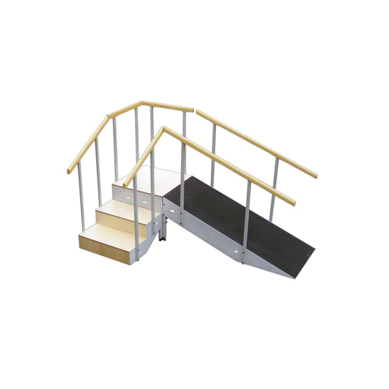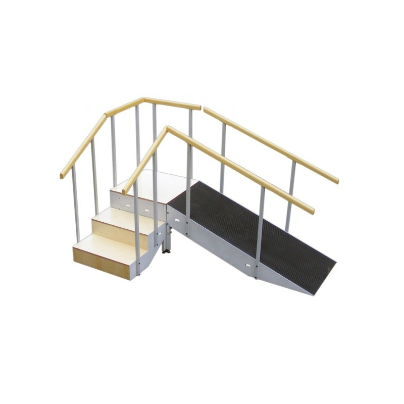 Garantía 3 añosEstructuras de acero con acabado en epoxy, pasamanos, peldaños y descanso en madera barnizado natural, rampa de madera con goma antideslizante. Consta de: Tres módulos independientes (peldaños, descanso y rampa) para que puedan colocarse en cualquier ángulo o en línea según las necesidades, mediante uniones de acero con acabado en epoxy de fácil montaje y desmontaje. Pasamanos desmontables. Medidas: - Alto escalón: 15 cm. - Pisada escalón: 28 cm. - Alto suelo-descanso: 45 cm. - Largo modulo rampa: 137 cm. - Largo modulo descanso: 60 cm. - Largo modulo peldaños: 56 cm. - Alto pasamanos: 73 cm. - Ancho interior: 60 cm. - Ancho exterior: 65 cm.