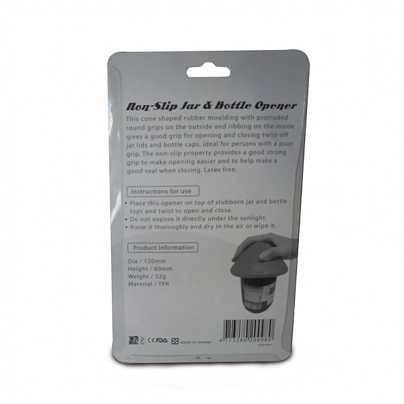 Es erfordert wenig Kraftaufwand, um Dosen, Gläser, Softdrinks, Flaschen usw. zu öffnen oder zu verschließen, da es rund vorstehende Vorsprünge hat. Diese bieten einen guten Halt an den inneren Rippen.