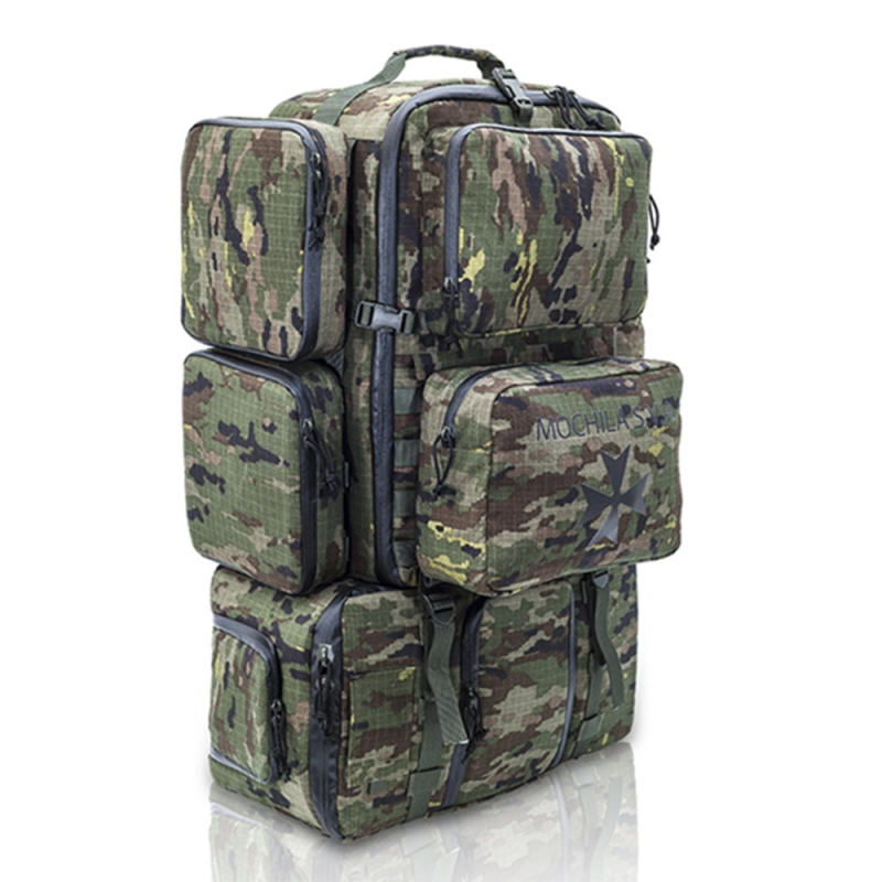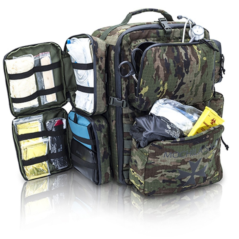 "Er besteht aus zwei aufsteckbaren Teilen und ist so konzipiert, dass er die gesamte medizinische Ausrüstung aufnehmen kann, die für jeden militärischen Notfall erforderlich ist, von einem Patienten mit leichten Verletzungen bis hin zu kritischen hämorrhagischen Eingriffen. Dadurch wird der Rucksack zu einem kompletten und leicht zugänglichen mobilen medizinischen Zentrum.