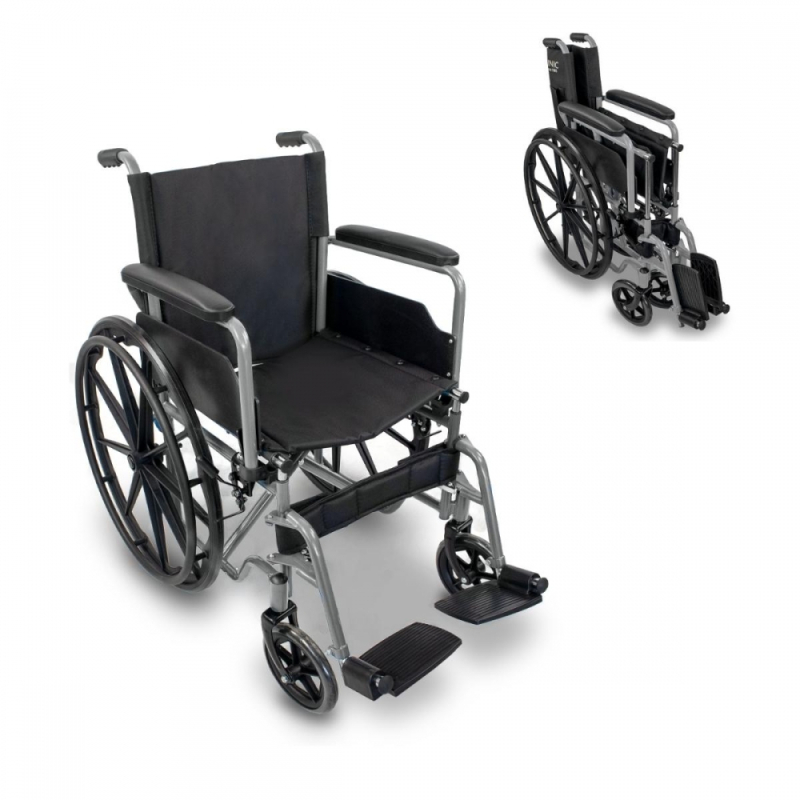 Die klappbaren und abnehmbaren Fußstützen sowie die vollständig klappbaren Armlehnen ermöglichen ein müheloses Zusammenklappen und machen den Rollstuhl überallhin tragbar. Zusätzlichen Stauraum bietet die Rückentasche.