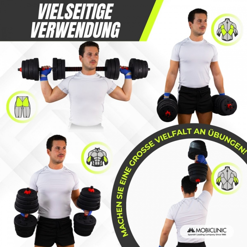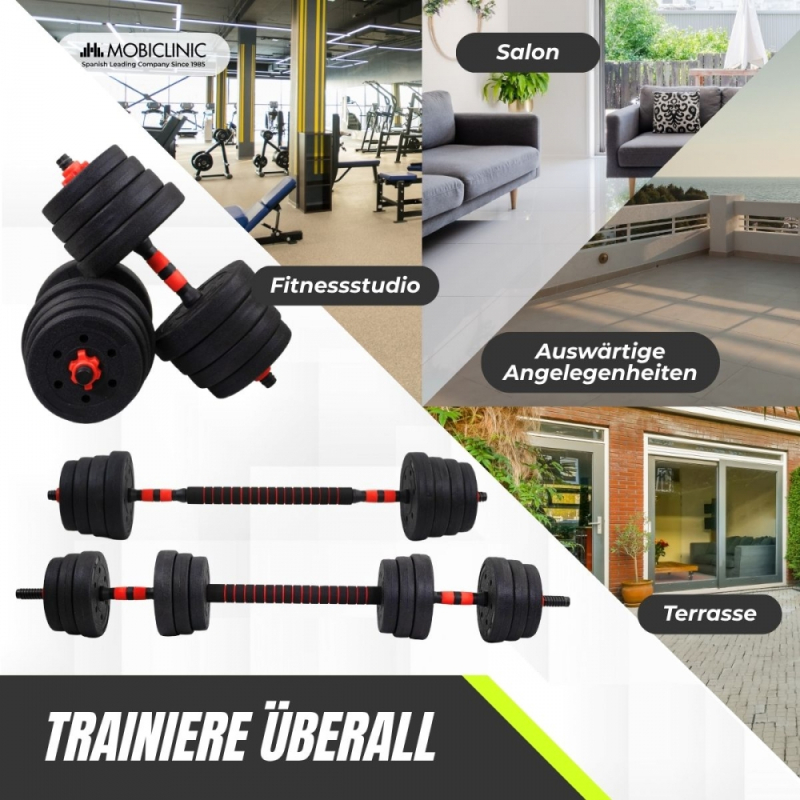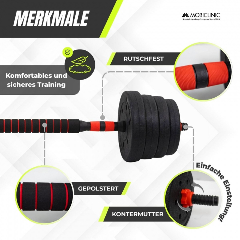 Paar 30 kg Hanteln | Verstellbar | 2 in 1 | Verbindungsstange | Tragbar | Abnehmbar | Mobimax | Mobiclinic
