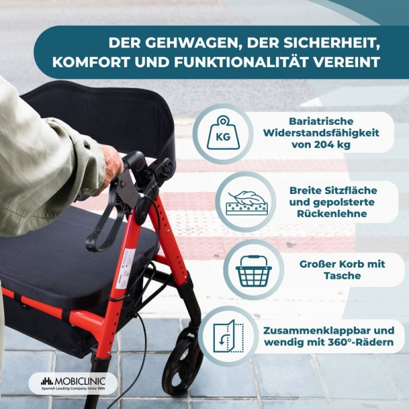 Der bariatrische Gehwagen Madeira Mobiclinic wurde für maximale Stabilität, Robustheit und Komfort entwickelt. Mit einer Tragkraft von bis zu 204 kg übertrifft er Standardmodelle (100–120 kg) bei weitem und ist daher ideal für übergewichtige Benutzer oder Personen, die sich mehr Sicherheit bei der Fortbewegung wünschen.