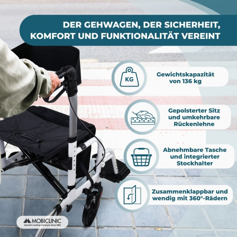 Rollator mit Fuß- und Rückenlehne | Faltbar | Aluminium | Bremsen | 360º Räder | Tasche | Stockhalterung | Ibiza | Mobiclinic