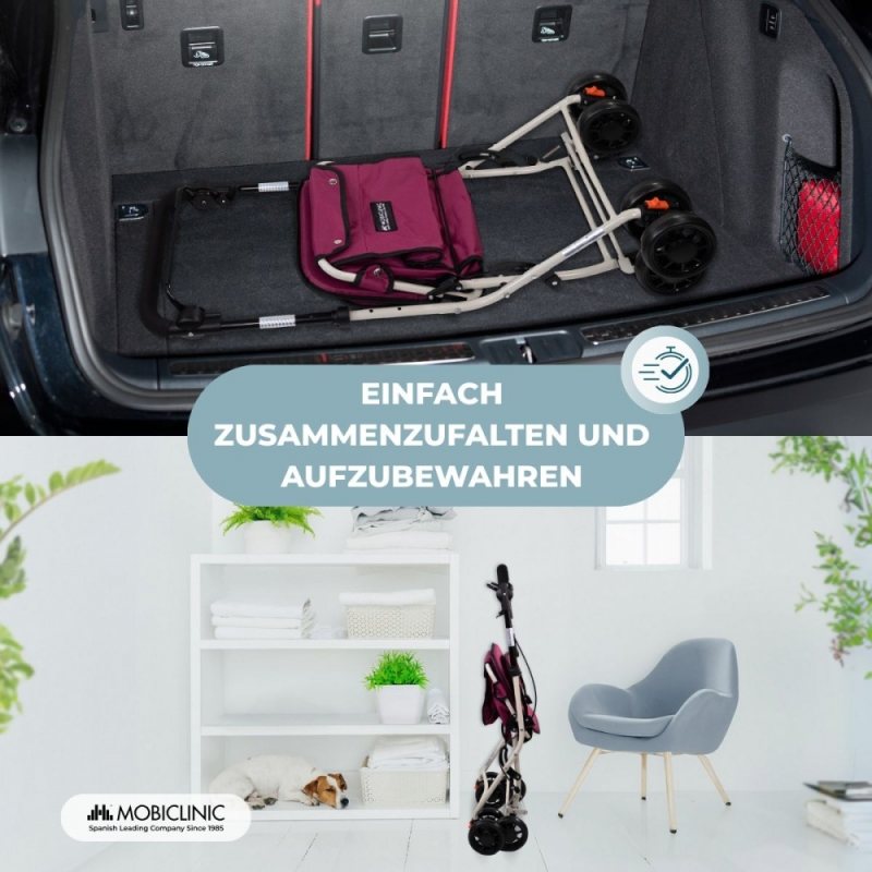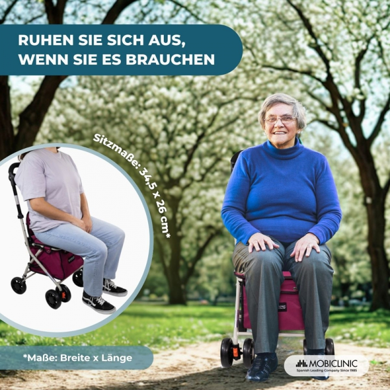 Einkaufswagen Gehwagen | 4 Räder | Bis 120 kg | Faltbar | Mit Tasche | Bremssystem | Fuchsia| Coliseum | Mobiclinic