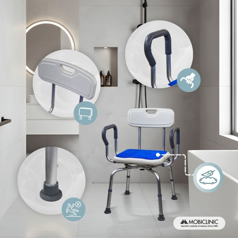 Drehbarer Badezimmerhocker | 360º Sitz | Höhenverstellbar | Armlehnen | EVA-Polsterung | Akila | Mobiclinic