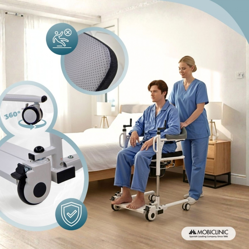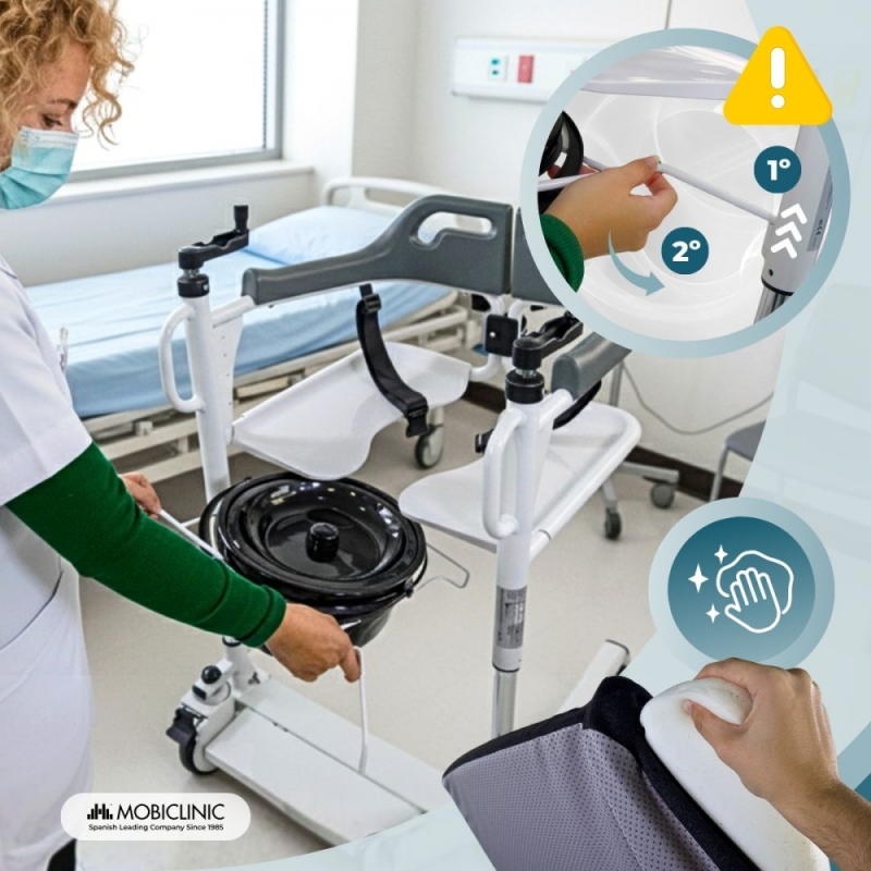 Silla de transferencia con inodoro | Altura regulable | Doble sistema seguridad | Cubeta y Cojín extraíble | Willy | Mobiclinic Noelia . El doble sistema de seguridad da mucha confianza al mover al paciente. 10/11/2025 |