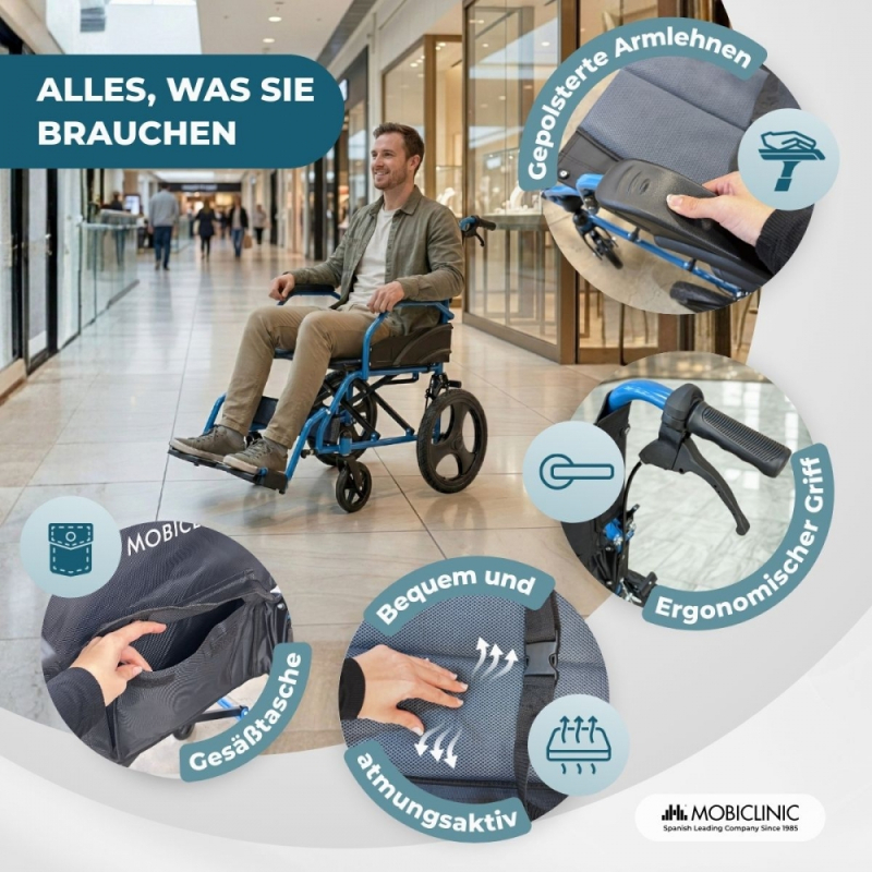Der Rollstuhl Pharaoh wurde als praktische, langlebige und komfortable Lösung für den täglichen Gebrauch im Innen- und Außenbereich entwickelt. Dank seines faltbaren Designs lässt er sich leicht im Auto transportieren und zu Hause verstauen und ist somit die ideale Wahl für Nutzer, die unkomplizierte Mobilität benötigen.